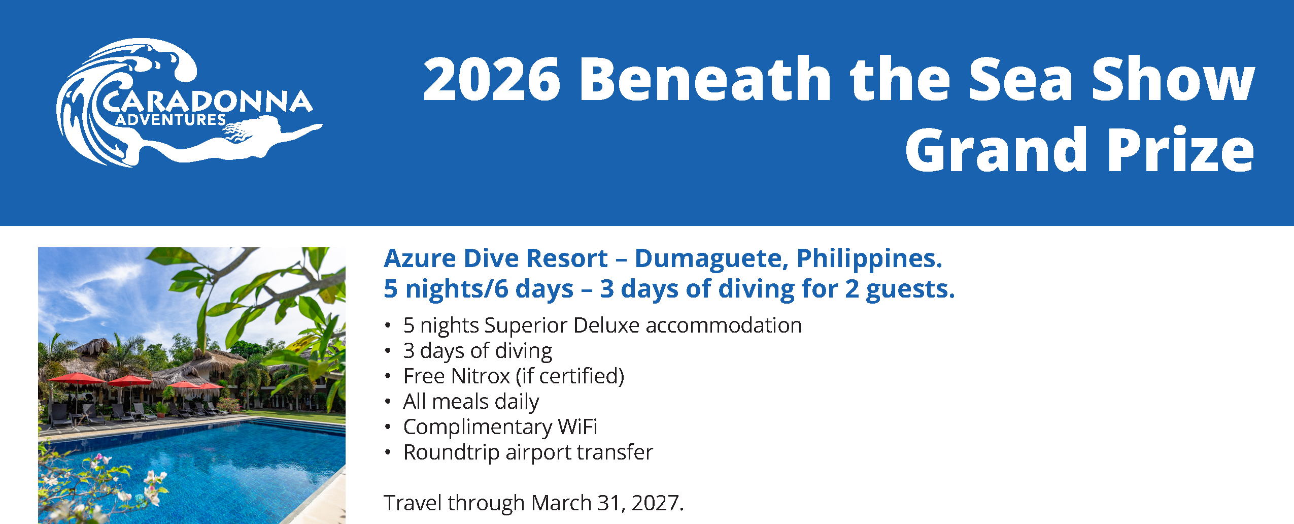Prize is not exchangeable, transferable, or refundable, and has no cash value. Travel is subject to availability and holidays, blackout dates also apply. Prize does not include round-trip air, rental vehicles, dive courses, dive equipment rental, personal purchases, hotel or dive gratuities, local tours, or marine park fees. Space is limited and reservations should be made as far in advance as possible. Winner and companion must be certified scuba divers to utilize the dive portion of this package.