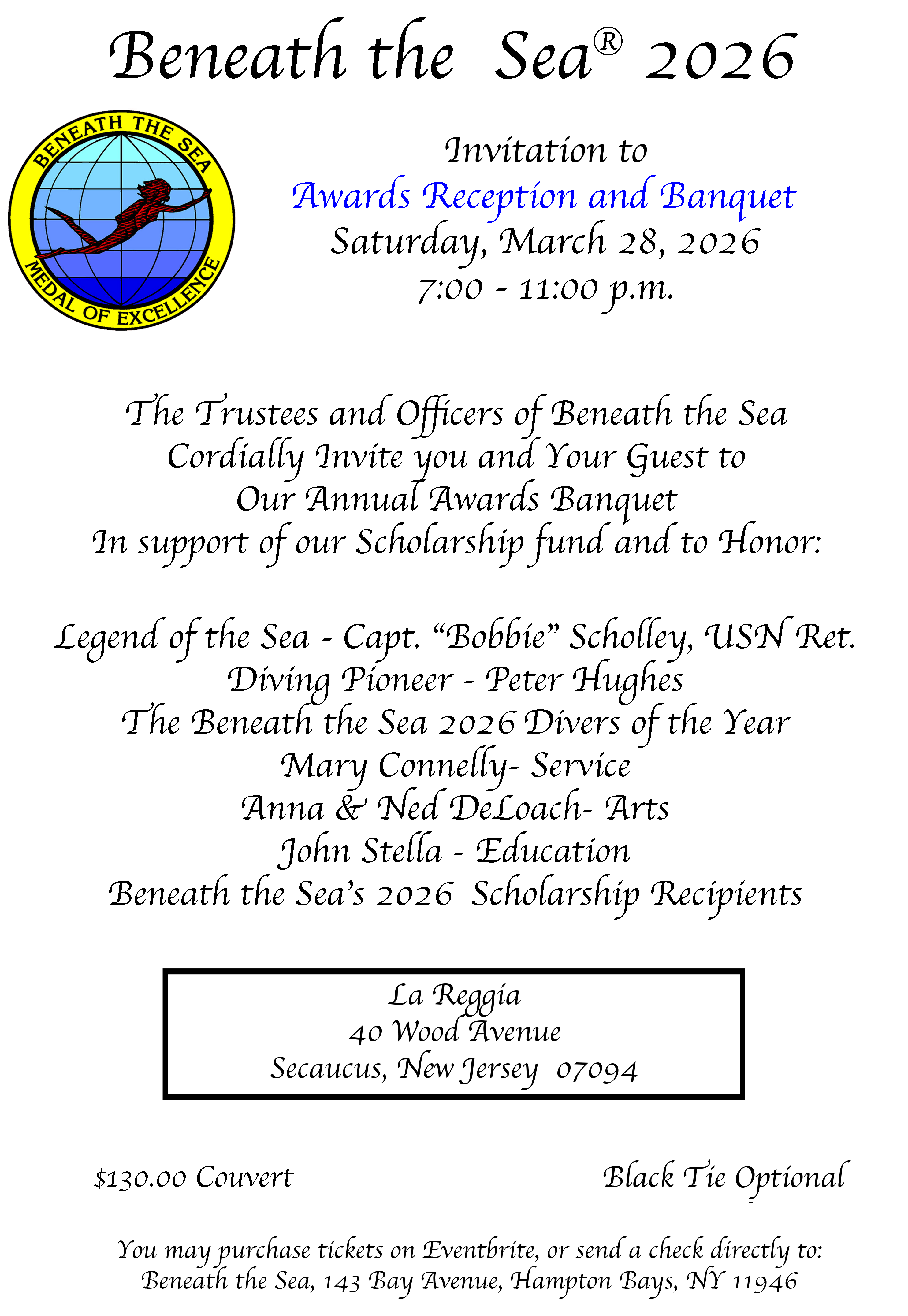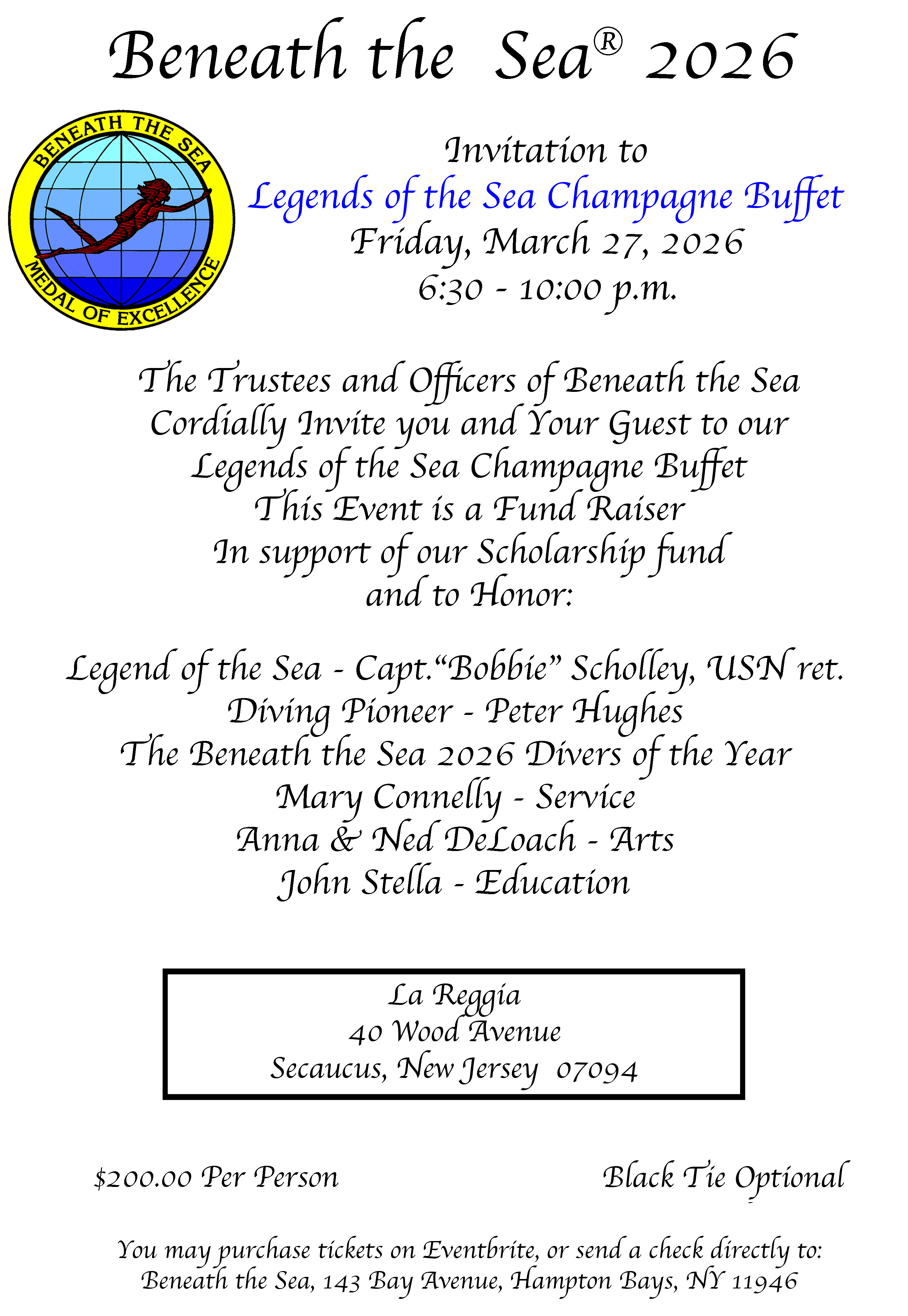Join us for an unforgettable Friday night affair - a glamorous champagne reception honoring and celebrating Beneath the Sea's awardees for 2026: Capt. "Bobbie" Scholley, USN Ret. as Legend of the Sea, Peter Hughes as Diving Pioneer, and Mary Connelly, Anna & Ned DeLoach, and John Stella as our distinguished Divers of the Year. Mingle with notable figures from the dive industry as they gather to recognize these remarkable individuals.
